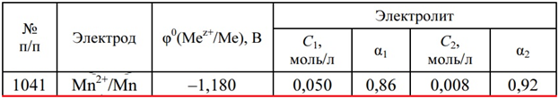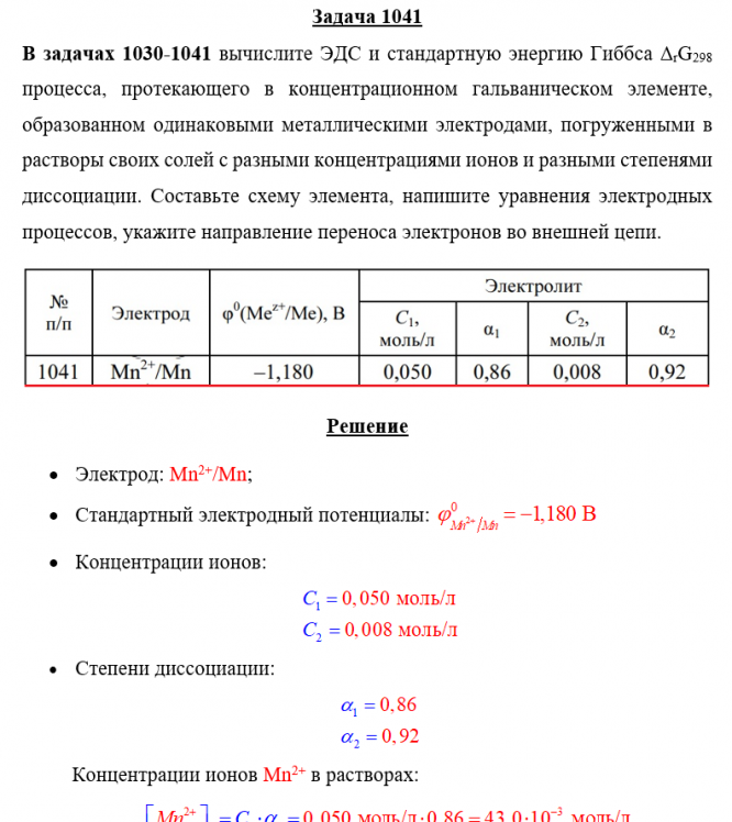 Главная » Учебные материалы » Химия » Решения задач » Несколько классов/семестров » Номер 1041 » Задача 1041 - вычислите ЭДС и стандартную энергию Гиббса ΔrG0298 процесса, протекающего в концентрационном гальваническом элементе, образованном одинаковыми металлическими электродами, погруженными в растворы своих солей с разными концентрациями ионо