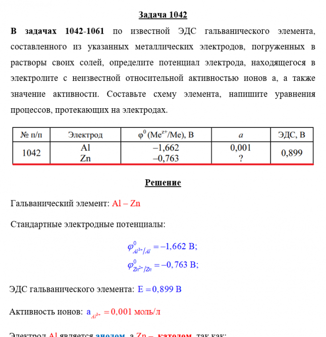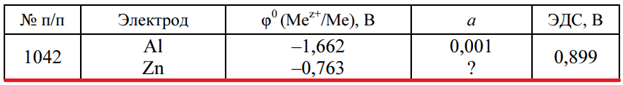Задача 1042 - по известной ЭДС гальванического элемента, составленного из указанных металлических электродов, погруженных в растворы своих солей, определите потенциал электрода, находящегося в электролите с неизвестной относительной активностью ионов