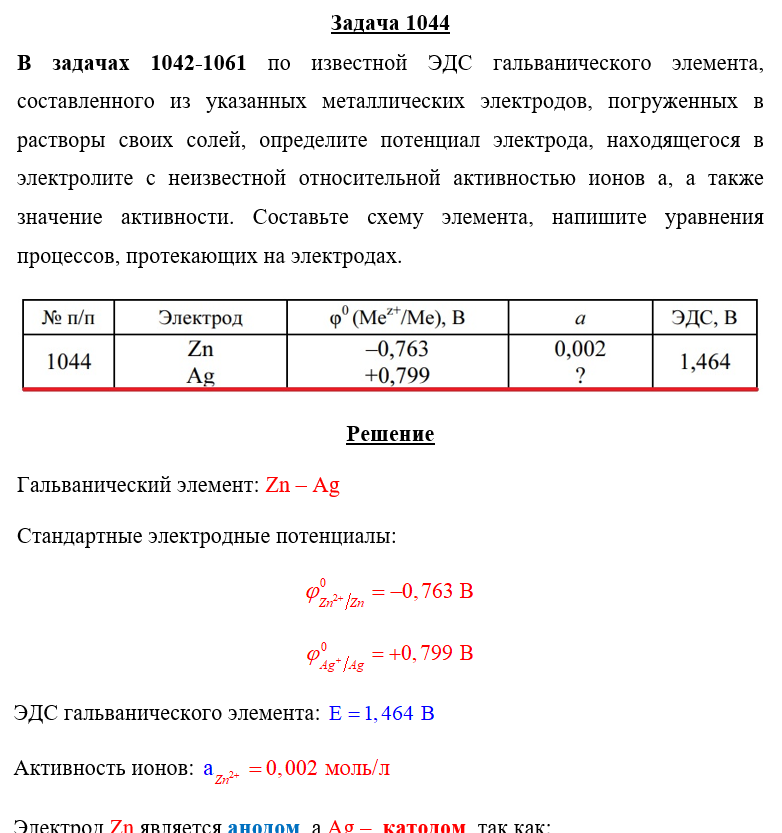 Для студентов по предмету ХимияЗадача 1044 - по известной ЭДС гальванического элемента, составленного из указанных металлических электродов, погруженных в растворы своих солей, опреЗадача 1044 - по известной ЭДС гальванического элемента, составленного из указанных металлических электродов, погруженных в растворы своих солей, опре