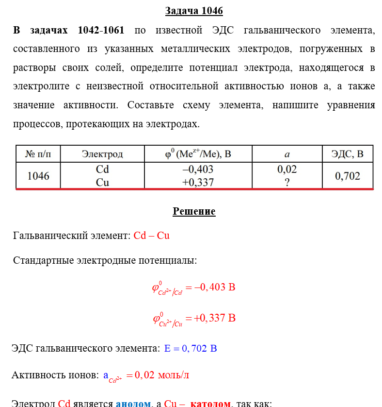 Задача 1046 - по известной ЭДС гальванического элемента, составленного из указанных металлических электродов, погруженных в растворы своих солей, определите потенциал электрода, находящегося в электролите с неизвестной относительной активностью ионов