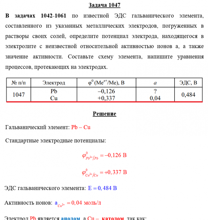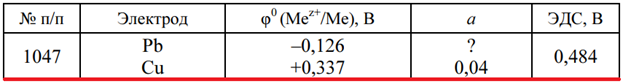 Задача 1047 - по известной ЭДС гальванического элемента, составленного из указанных металлических электродов, погруженных в растворы своих солей, определите потенциал электрода, находящегося в электролите с неизвестной относительной активностью ионов