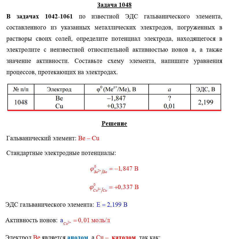 Для студентов по предмету ХимияЗадача 1048 - по известной ЭДС гальванического элемента, составленного из указанных металлических электродов, погруженных в растворы своих солей, опреЗадача 1048 - по известной ЭДС гальванического элемента, составленного из указанных металлических электродов, погруженных в растворы своих солей, опре