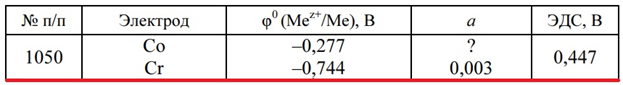 Задача 1050 - по известной ЭДС гальванического элемента, составленного из указанных металлических электродов, погруженных в растворы своих солей, определите потенциал электрода, находящегося в электролите с неизвестной относительной активностью ионов