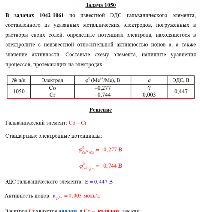 Для студентов по предмету ХимияЗадача 1050 - по известной ЭДС гальванического элемента, составленного из указанных металлических электродов, погруженных в растворы своих солей, опреЗадача 1050 - по известной ЭДС гальванического элемента, составленного из указанных металлических электродов, погруженных в растворы своих солей, опре