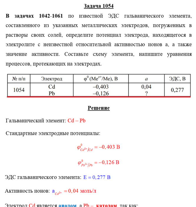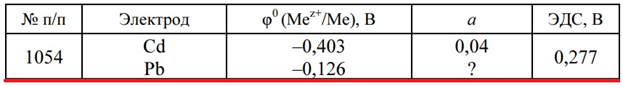Задача 1054 - по известной ЭДС гальванического элемента, составленного из указанных металлических электродов, погруженных в растворы своих солей, определите потенциал электрода, находящегося в электролите с неизвестной относительной активностью ионов