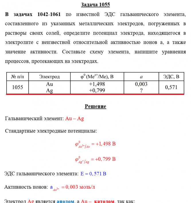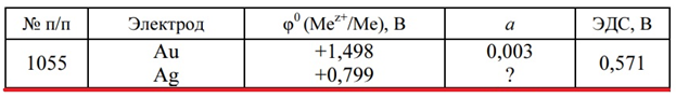 Задача 1055 - по известной ЭДС гальванического элемента, составленного из указанных металлических электродов, погруженных в растворы своих солей, определите потенциал электрода, находящегося в электролите с неизвестной относительной активностью ионов