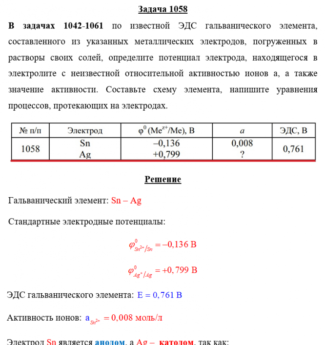Для студентов по предмету ХимияЗадача 1058 - по известной ЭДС гальванического элемента, составленного из указанных металлических электродов, погруженных в растворы своих солей, опреЗадача 1058 - по известной ЭДС гальванического элемента, составленного из указанных металлических электродов, погруженных в растворы своих солей, опре
