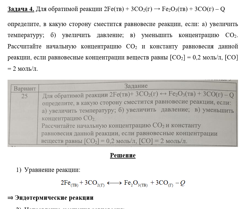 Для обратимой реакции 2Fe(тв) + 3СО2(г) → Fe2O3(тв) + 3CO(г) – Q определите, в какую сторону сместится равновесие реакции, если: а) увеличить температуру; б) увеличить давление; в) уменьшить концентрацию СО2. Рассчитайте начальную концентрацию СО2 и константу равновесия данной реакции, если равновесные концентрации веществ равны [СО2] = 0,2 моль/л, [СО] = 2 моль/л. .