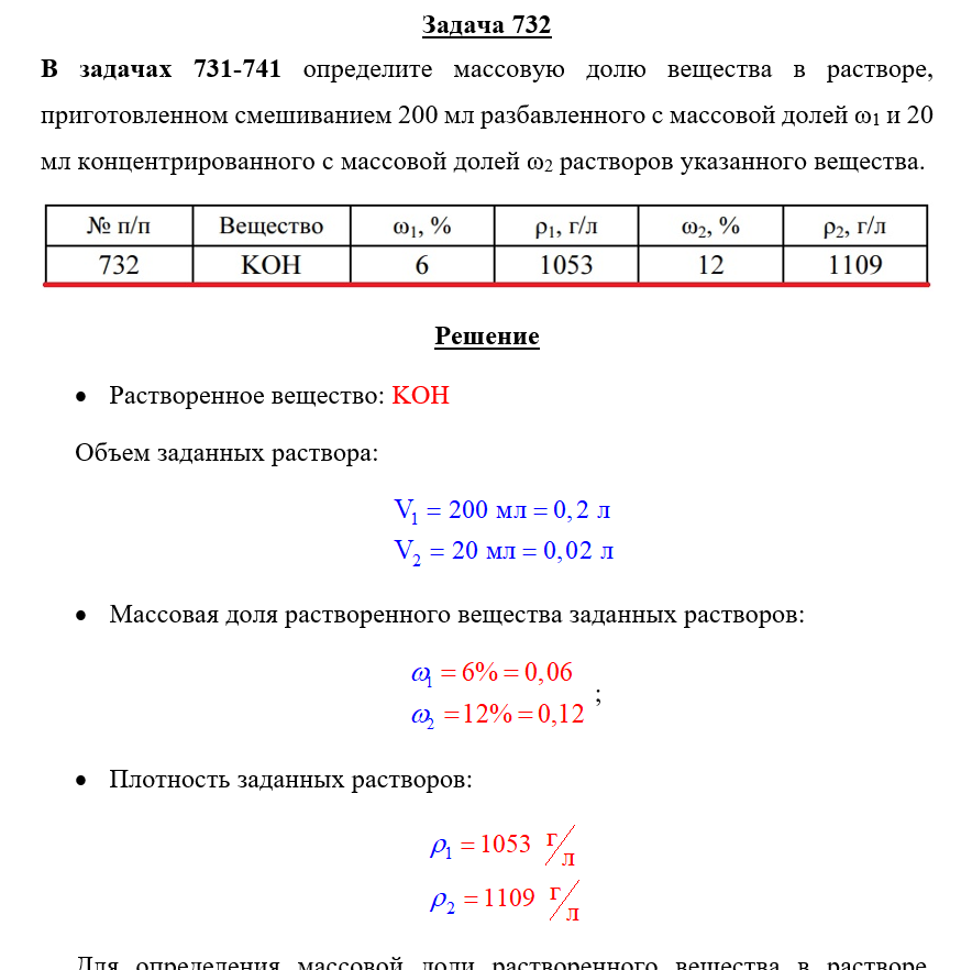 Для студентов по предмету ХимияЗадача 732 - определите массовую долю вещества в растворе, приготовленном смешиванием 200 мл разбавленного с массовой долей ω1 и 20 мл концентрированнЗадача 732 - определите массовую долю вещества в растворе, приготовленном смешиванием 200 мл разбавленного с массовой долей ω1 и 20 мл концентрированн