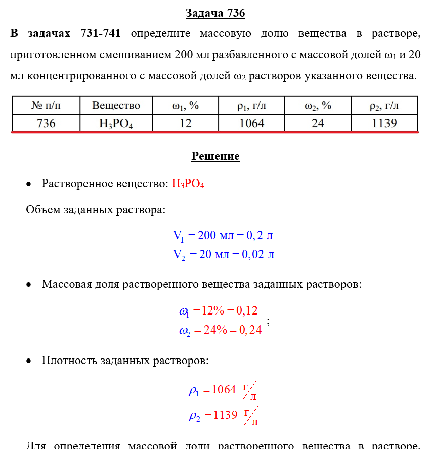 Для студентов по предмету ХимияЗадача 736 - определите массовую долю вещества в растворе, приготовленном смешиванием 200 мл разбавленного с массовой долей ω1 и 20 мл концентрированнЗадача 736 - определите массовую долю вещества в растворе, приготовленном смешиванием 200 мл разбавленного с массовой долей ω1 и 20 мл концентрированн