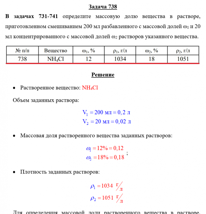 Для студентов по предмету ХимияЗадача 738 - определите массовую долю вещества в растворе, приготовленном смешиванием 200 мл разбавленного с массовой долей ω1 и 20 мл концентрированнЗадача 738 - определите массовую долю вещества в растворе, приготовленном смешиванием 200 мл разбавленного с массовой долей ω1 и 20 мл концентрированн