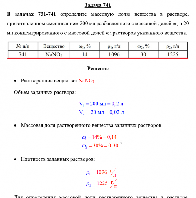 Задача 741 - определите массовую долю вещества в растворе, приготовленном смешиванием 200 мл разбавленного с массовой долей ω1 и 20 мл концентрированного с массовой долей ω2 растворов указанного вещества.