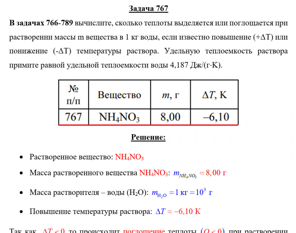 Для студентов по предмету ХимияЗадача 767 - вычислите, сколько теплоты выделяется или поглощается при растворении массы m вещества в 1 кг воды, если известно повышение (+ΔТ) или понЗадача 767 - вычислите, сколько теплоты выделяется или поглощается при растворении массы m вещества в 1 кг воды, если известно повышение (+ΔТ) или пон