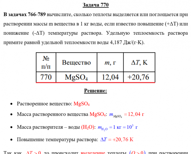 Для студентов по предмету ХимияЗадача 770 - вычислите, сколько теплоты выделяется или поглощается при растворении массы m вещества в 1 кг воды, если известно повышение (+ΔТ) или понЗадача 770 - вычислите, сколько теплоты выделяется или поглощается при растворении массы m вещества в 1 кг воды, если известно повышение (+ΔТ) или пон