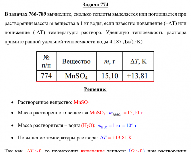 Для студентов по предмету ХимияЗадача 774 - вычислите, сколько теплоты выделяется или поглощается при растворении массы m вещества в 1 кг воды, если известно повышение (+ΔТ) или понЗадача 774 - вычислите, сколько теплоты выделяется или поглощается при растворении массы m вещества в 1 кг воды, если известно повышение (+ΔТ) или пон