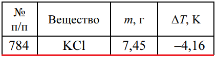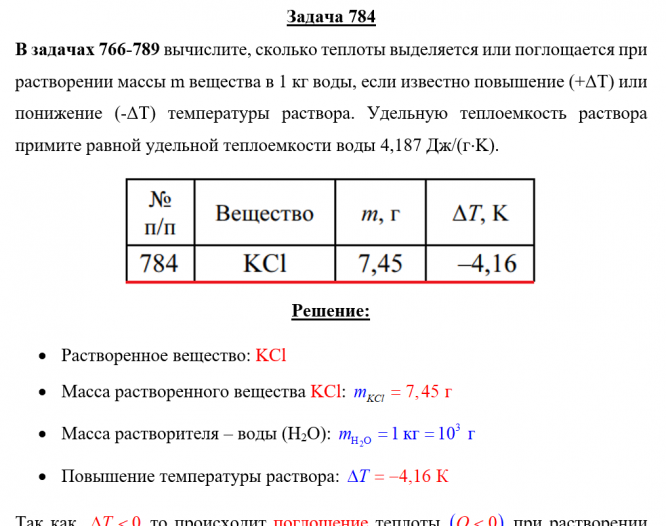Задача 784 - вычислите, сколько теплоты выделяется или поглощается при растворении массы m вещества в 1 кг воды, если известно повышение (+ΔТ) или понижение (-ΔТ) температуры раствора. Удельную теплоемкость раствора примите равной удельной теплоемкос
