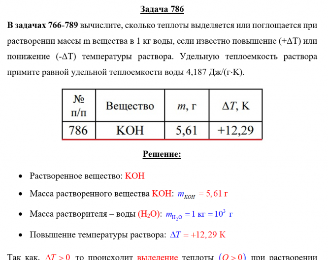 Задача 786 - вычислите, сколько теплоты выделяется или поглощается при растворении массы m вещества в 1 кг воды, если известно повышение (+ΔТ) или понижение (-ΔТ) температуры раствора. Удельную теплоемкость раствора примите равной удельной теплоемкос