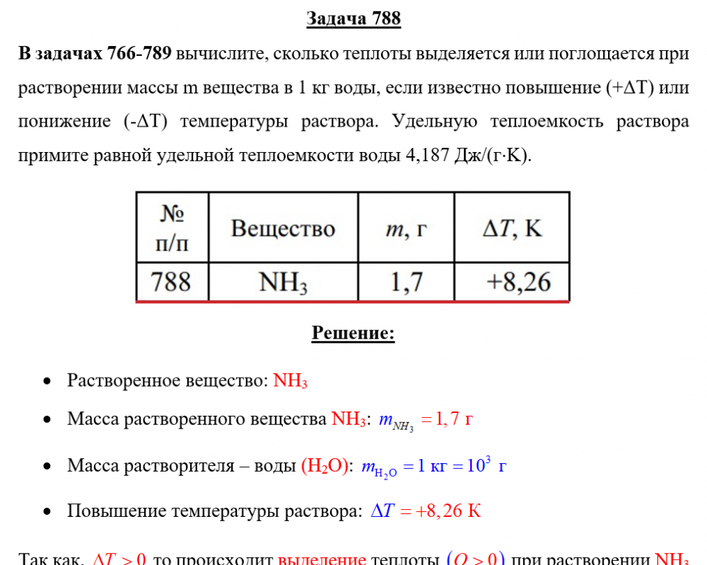 Для студентов по предмету ХимияЗадача 788 - вычислите, сколько теплоты выделяется или поглощается при растворении массы m вещества в 1 кг воды, если известно повышение (+ΔТ) или понЗадача 788 - вычислите, сколько теплоты выделяется или поглощается при растворении массы m вещества в 1 кг воды, если известно повышение (+ΔТ) или пон