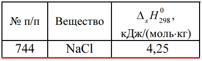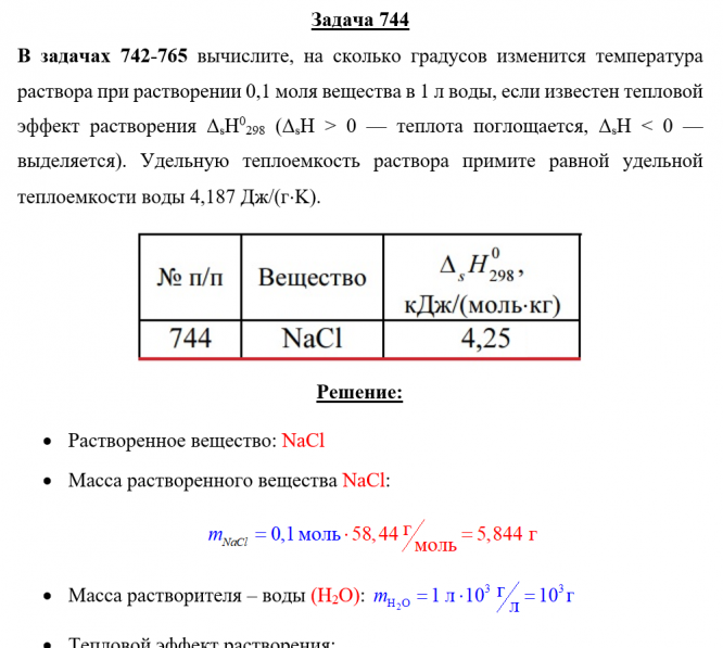 Задача 744 - вычислите, на сколько градусов изменится температура раствора при растворении 0,1 моля вещества в 1 л воды, если известен тепловой эффект растворения ΔsH0298 (ΔsH > 0 — теплота поглощается, ΔsH < 0 — выделяется). Удельную теплоемкость ра