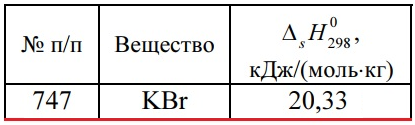 Главная » Учебные материалы » Химия » Решения задач » Несколько классов/семестров » Номер 747 » Задача 747 - вычислите, на сколько градусов изменится температура раствора при растворении 0,1 моля вещества в 1 л воды, если известен тепловой эффект растворения ΔsH0298 (ΔsH > 0 — теплота поглощается, ΔsH < 0 — выделяется). Удельную теплоемкость ра