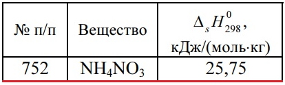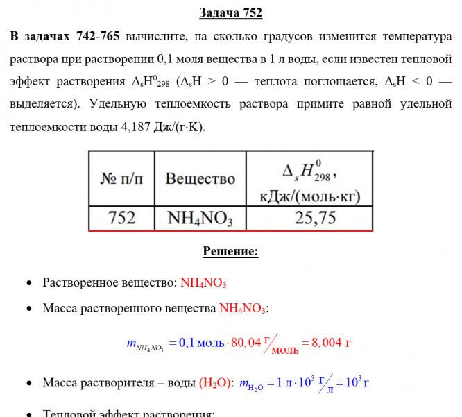 Задача 752 - вычислите, на сколько градусов изменится температура раствора при растворении 0,1 моля вещества в 1 л воды, если известен тепловой эффект растворения ΔsH0298 (ΔsH > 0 — теплота поглощается, ΔsH < 0 — выделяется). Удельную теплоемкость ра