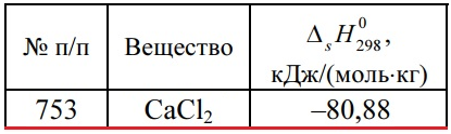 Задача 753 - вычислите, на сколько градусов изменится температура раствора при растворении 0,1 моля вещества в 1 л воды, если известен тепловой эффект растворения ΔsH0298 (ΔsH > 0 — теплота поглощается, ΔsH < 0 — выделяется). Удельную теплоемкость ра