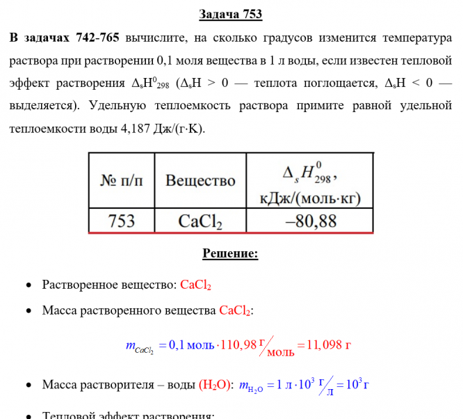 Для студентов по предмету ХимияЗадача 753 - вычислите, на сколько градусов изменится температура раствора при растворении 0,1 моля вещества в 1 л воды, если известен тепловой эффектЗадача 753 - вычислите, на сколько градусов изменится температура раствора при растворении 0,1 моля вещества в 1 л воды, если известен тепловой эффект