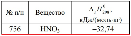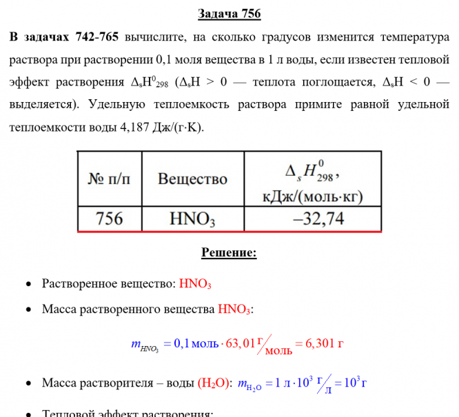 Задача 756 - вычислите, на сколько градусов изменится температура раствора при растворении 0,1 моля вещества в 1 л воды, если известен тепловой эффект растворения ΔsH0298 (ΔsH > 0 — теплота поглощается, ΔsH < 0 — выделяется). Удельную теплоемкость ра