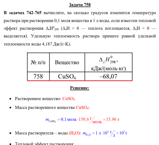 Задача 758 - вычислите, на сколько градусов изменится температура раствора при растворении 0,1 моля вещества в 1 л воды, если известен тепловой эффект растворения ΔsH0298 (ΔsH > 0 — теплота поглощается, ΔsH < 0 — выделяется). Удельную теплоемкость ра