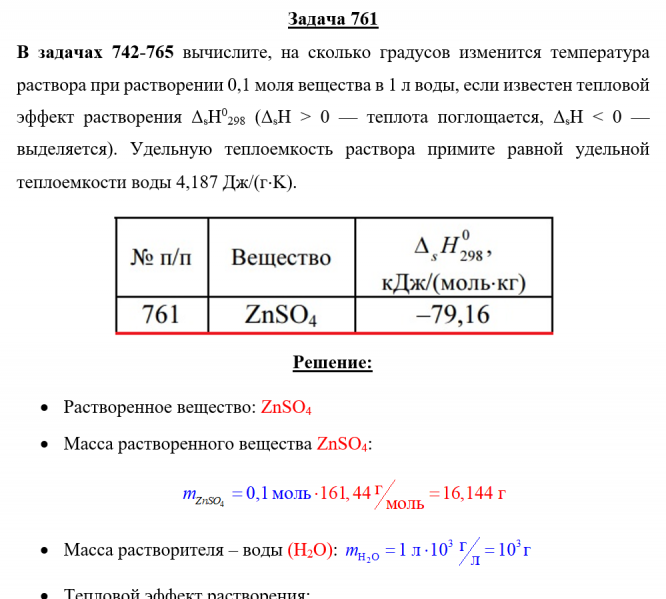 Задача 761 - вычислите, на сколько градусов изменится температура раствора при растворении 0,1 моля вещества в 1 л воды, если известен тепловой эффект растворения ΔsH0298 (ΔsH > 0 — теплота поглощается, ΔsH < 0 — выделяется). Удельную теплоемкость ра