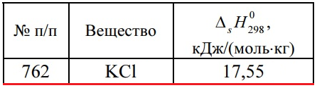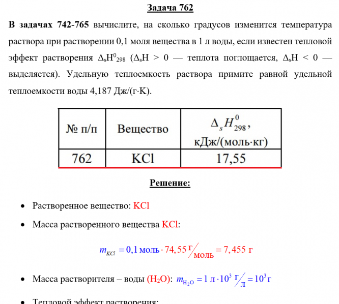 Задача 762 - вычислите, на сколько градусов изменится температура раствора при растворении 0,1 моля вещества в 1 л воды, если известен тепловой эффект растворения ΔsH0298 (ΔsH > 0 — теплота поглощается, ΔsH < 0 — выделяется). Удельную теплоемкость ра