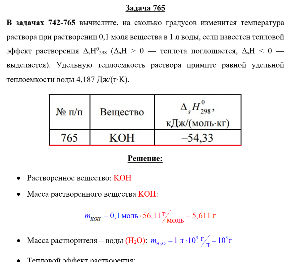 Для студентов по предмету ХимияЗадача 765 - вычислите, на сколько градусов изменится температура раствора при растворении 0,1 моля вещества в 1 л воды, если известен тепловой эффектЗадача 765 - вычислите, на сколько градусов изменится температура раствора при растворении 0,1 моля вещества в 1 л воды, если известен тепловой эффект