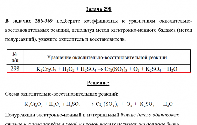 Задача 298 - подберите коэффициенты к уравнениям окислительно-восстановительных реакций, используя метод электронно-ионного баланса (метод полуреакций), укажите окислитель и восстановитель.
