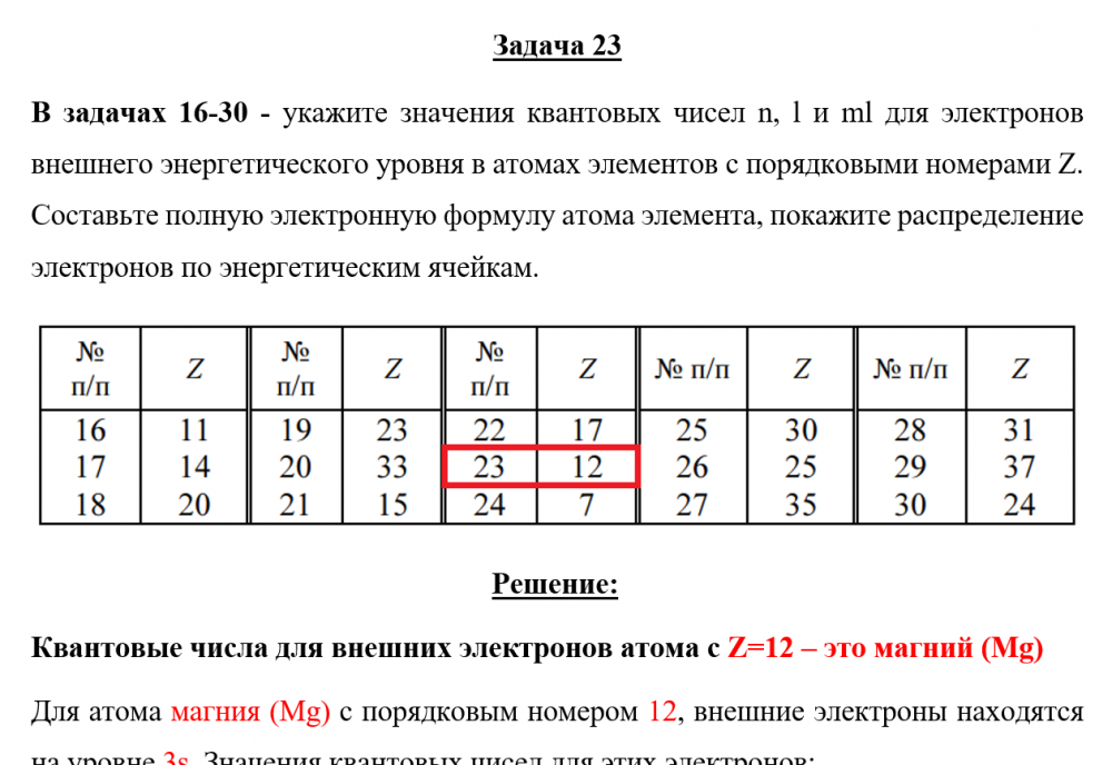 Задача 23 - укажите значения квантовых чисел n, l и ml для электронов внешнего энергетического уровня в атомах элементов с порядковыми номерами Z. Составьте полную электронную формулу атома элемента, покажите распределение электронов по энергетически