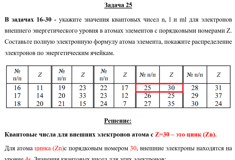 Задача 25 - укажите значения квантовых чисел n, l и ml для электронов внешнего энергетического уровня в атомах элементов с порядковыми номерами Z. Составьте полную электронную формулу атома элемента, покажите распределение электронов по энергетически