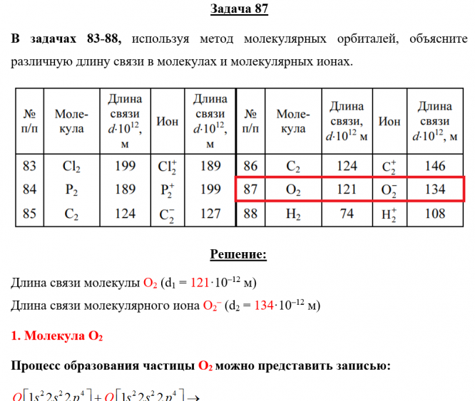 Задача 87: Задача 87 - используя метод молекулярных орбиталей, объясните различную длину связи в молекулах и молекулярных ионах.