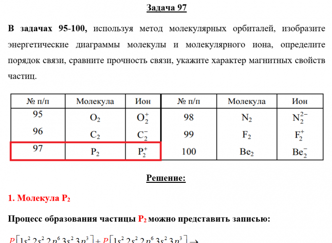Задача 97 - используя метод молекулярных орбиталей, изобразите энергетические диаграммы молекулы и молекулярного иона, определите порядок связи, сравните прочность связи, укажите характер магнитных свойств частиц.
