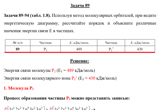 Задачи 89-94 (табл. 1.8). Используя метод молекулярных орбиталей, приведите энергетическую диаграмму, рассчитайте порядок и объясните различные значения энергии связи E в частицах.