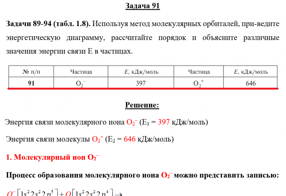 Задача 91 - Используя метод молекулярных орбиталей, приведите энергетическую диаграмму, рассчитайте порядок и объясните различные значения энергии связи E в частицах.