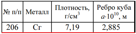 Задача 206 - определите, используя приведенные ниже экспериментальные данные, структурный тип кристаллической решетки, в которой кристаллизуется данный металл (гранецентрированная кубическая, объемно-центрированная кубическая или типа алмаза), рассчи