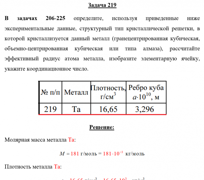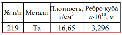 Задача 219 - определите, используя приведенные ниже экспериментальные данные, структурный тип кристаллической решетки, в которой кристаллизуется данный металл (гранецентрированная кубическая, объемно-центрированная кубическая или типа алмаза), рассчи