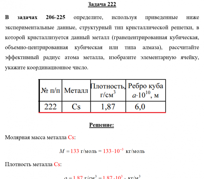 Главная » Учебные материалы » Химия » Решения задач » Несколько классов/семестров » Номер 222 » Задача 222 - определите, используя приведенные ниже экспериментальные данные, структурный тип кристаллической решетки, в которой кристаллизуется данный металл (гранецентрированная кубическая, объемно-центрированная кубическая или типа алмаза), рассчи