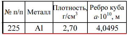 Задача 225 - определите, используя приведенные ниже экспериментальные данные, структурный тип кристаллической решетки, в которой кристаллизуется данный металл (гранецентрированная кубическая, объемно-центрированная кубическая или типа алмаза), рассчи