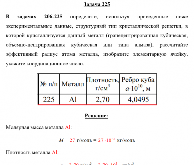Главная » Учебные материалы » Химия » Решения задач » Несколько классов/семестров » Номер 225 » Задача 225 - определите, используя приведенные ниже экспериментальные данные, структурный тип кристаллической решетки, в которой кристаллизуется данный металл (гранецентрированная кубическая, объемно-центрированная кубическая или типа алмаза), рассчи