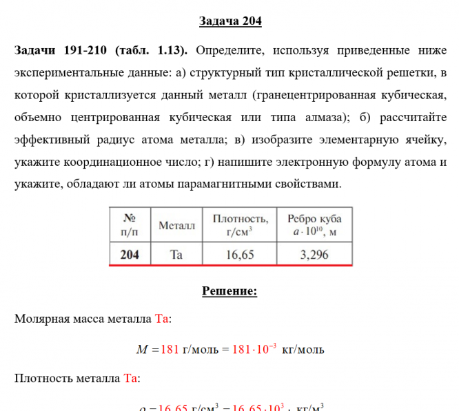 Задачи 191-210 (табл. 1.13). Определите, используя приведенные ниже экспериментальные данные: а) структурный тип кристаллической решетки, в которой кристаллизуется данный металл (гранецентрированная кубическая, объемно центрированная кубическая или типа алмаза); б) рассчитайте эффективный радиус атома металла; в) изобразите элементарную ячейку, укажите координационное число; г) напишите электронную формулу атома и укажите, обладают ли атомы парамагнитными свойствами.