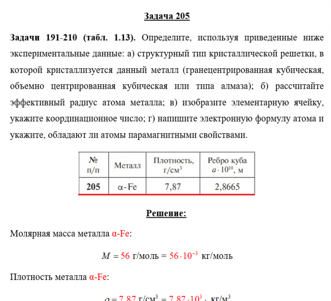 Задачи 191-210 (табл. 1.13). Определите, используя приведенные ниже экспериментальные данные: а) структурный тип кристаллической решетки, в которой кристаллизуется данный металл (гранецентрированная кубическая, объемно центрированная кубическая или типа алмаза); б) рассчитайте эффективный радиус атома металла; в) изобразите элементарную ячейку, укажите координационное число; г) напишите электронную формулу атома и укажите, обладают ли атомы парамагнитными свойствами.