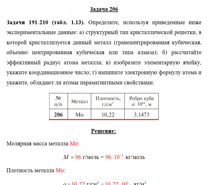 Задачи 191-210 (табл. 1.13). Определите, используя приведенные ниже экспериментальные данные: а) структурный тип кристаллической решетки, в которой кристаллизуется данный металл (гранецентрированная кубическая, объемно центрированная кубическая или типа алмаза); б) рассчитайте эффективный радиус атома металла; в) изобразите элементарную ячейку, укажите координационное число; г) напишите электронную формулу атома и укажите, обладают ли атомы парамагнитными свойствами.
