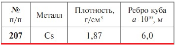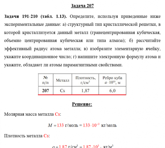 Задачи 191-210 (табл. 1.13). Определите, используя приведенные ниже экспериментальные данные: а) структурный тип кристаллической решетки, в которой кристаллизуется данный металл (гранецентрированная кубическая, объемно центрированная кубическая или типа алмаза); б) рассчитайте эффективный радиус атома металла; в) изобразите элементарную ячейку, укажите координационное число; г) напишите электронную формулу атома и укажите, обладают ли атомы парамагнитными свойствами.