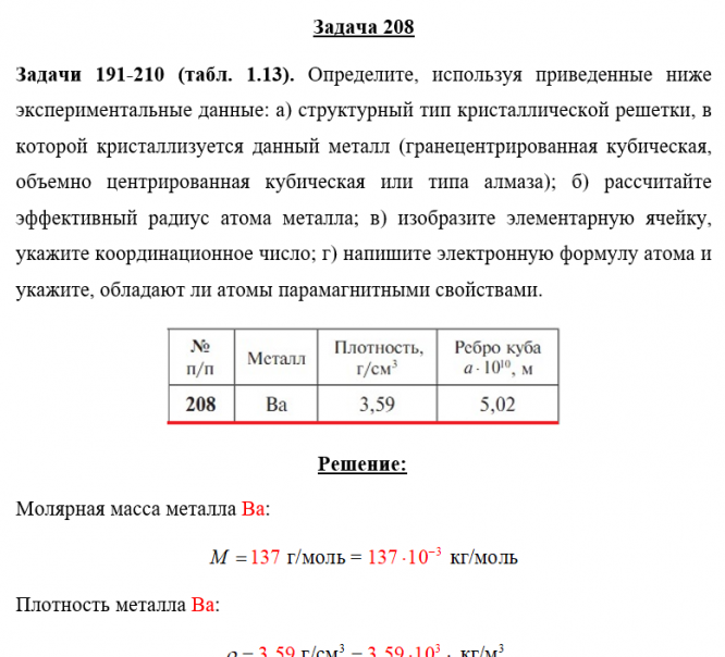 Задачи 191-210 (табл. 1.13). Определите, используя приведенные ниже экспериментальные данные: а) структурный тип кристаллической решетки, в которой кристаллизуется данный металл (гранецентрированная кубическая, объемно центрированная кубическая или типа алмаза); б) рассчитайте эффективный радиус атома металла; в) изобразите элементарную ячейку, укажите координационное число; г) напишите электронную формулу атома и укажите, обладают ли атомы парамагнитными свойствами.