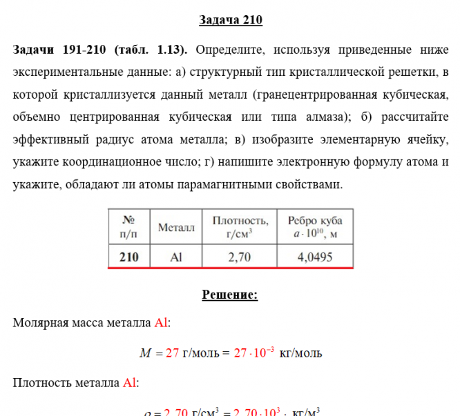 Задачи 191-210 (табл. 1.13). Определите, используя приведенные ниже экспериментальные данные: а) структурный тип кристаллической решетки, в которой кристаллизуется данный металл (гранецентрированная кубическая, объемно центрированная кубическая или типа алмаза); б) рассчитайте эффективный радиус атома металла; в) изобразите элементарную ячейку, укажите координационное число; г) напишите электронную формулу атома и укажите, обладают ли атомы парамагнитными свойствами..